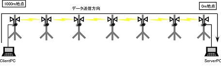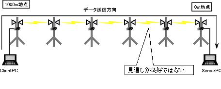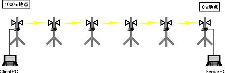 距離1km、ほぼ直線のマルチホップ環境下でのメッシュ無線LAN通信において、