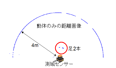 - 距離画像の作成。中央にある側域センサーからとの距離を示すイメージです。様々な物体の距離情報の中から、動体の情報を得ることができます。