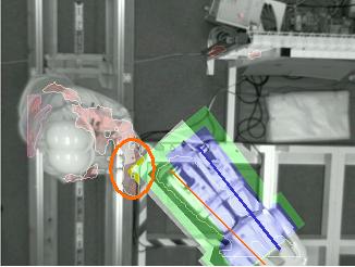 オレンジ色の○は作業者と衝突の可能性がある検出エーリアを示しています。青い線はロボットを停止する命令を出したときのロボット位置を示します。オレンジ線はロボットは実際に止まった時の位置を示します。