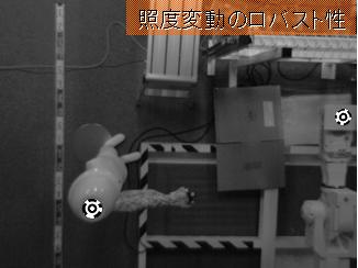 - 照度変動に対するロバスト性。上のイメージと同じように位置の確認できます。この例では場面は暗くなっても、マーカーの検出精度が落ちません。