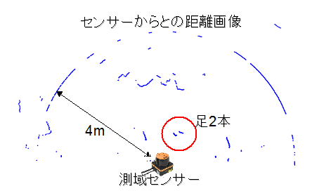 オレンジ色の○は作業者と衝突の可能性がある検出エーリアを示しています。青い線はロボットを停止する命令を出したときのロボット位置を示します。オレンジ線はロボットは実際に止まった時の位置を示します。